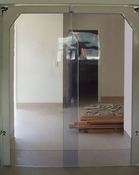 5 mm thick clear plastic sheet is available, which is used for personnel foot traffic with occassional trolley which also makes the doors more economical and more light weight allowing them to open with a lighter push of the hand as oposed to the 7mm thick PVC Sheet.